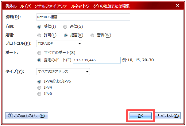- 「NetBIOS拒否」のルールがいちばん上に追加されます。