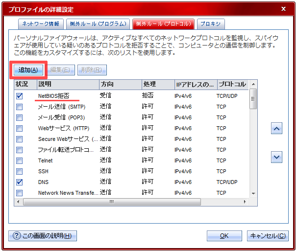 ![最上部にある [例外ルール(プロトコル)] のタブをクリックしてから、[追加] をクリック](img/tvb2010-03s.png)