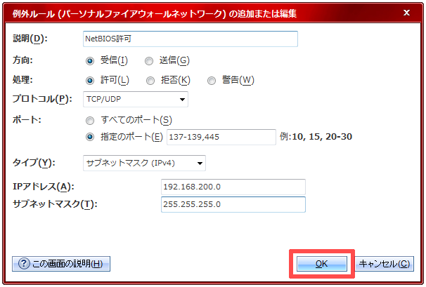 「NetBIOS許可」のルールがいちばん上に追加されたことを確認して、[OK] をクリックします。