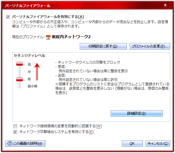 ウイルスバスターの設定によっては、上のメッセージパネルが出ない場合があります。その場合、ウイルスバスターの「セキュリティレベル」を一時的に「高」に設定してパソコンを再起動してから超漢字Vを起動してみてください。(「許可」の選択が終わった後はセキュリティレベルを元に戻してください。設定は以下の手順「5.」の画面でできます。)