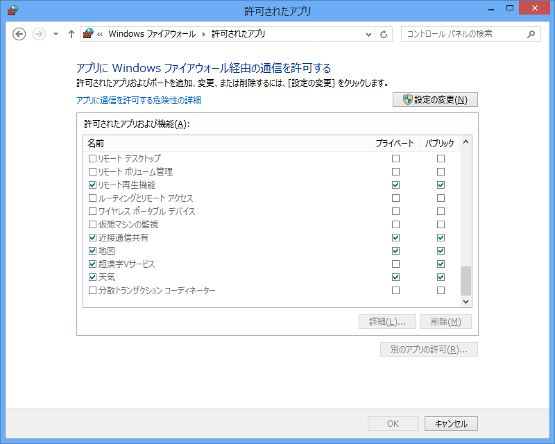 - 「名前」の一覧に「超漢字Vサービス」があり、チェックが付いていることを確認してください。「超漢字Vサービス」の名前がない場合、「超漢字Vサービス」がうまくインストールされていないか、Windows ファイアウォールの設定を初期化してしまった可能性があります。