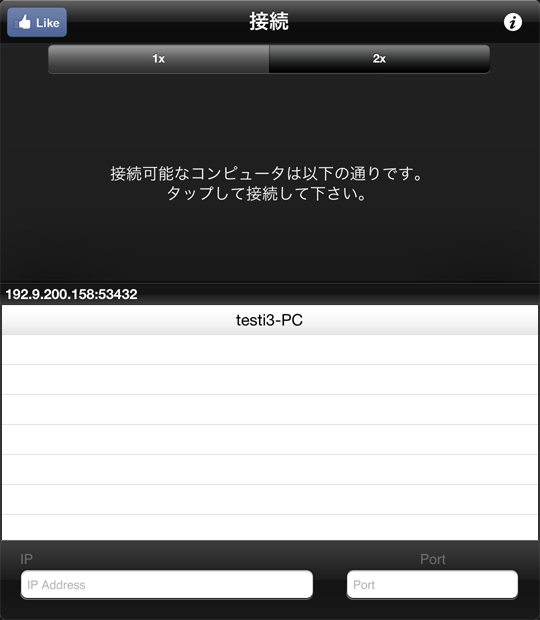 iPadのRetinaディスプレイの場合、画面上方に「1x」と「2x」のボタンがあり、2048×1536ドットもしくは1024×768ドットの解像度として使うかを選択できます。