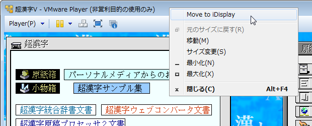 Windowsマシンで超漢字Vを起動し、タイトルバーを右クリックして 「Move to iDisplay」 をクリックすると、サブディスプレイに簡単に移動できます。