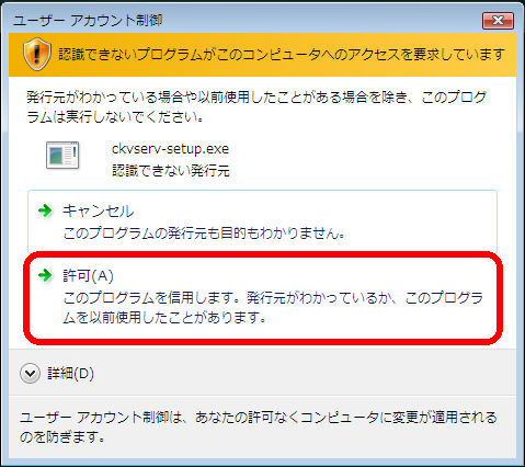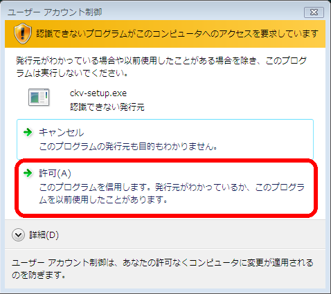 ほかのウィンドウに隠れている場合がありますが、タスクバーに表示されている「ckv-setup.exeがアクセス許可を要求しています」のボタンが点滅している場合は、そちらをクリックしてください)。