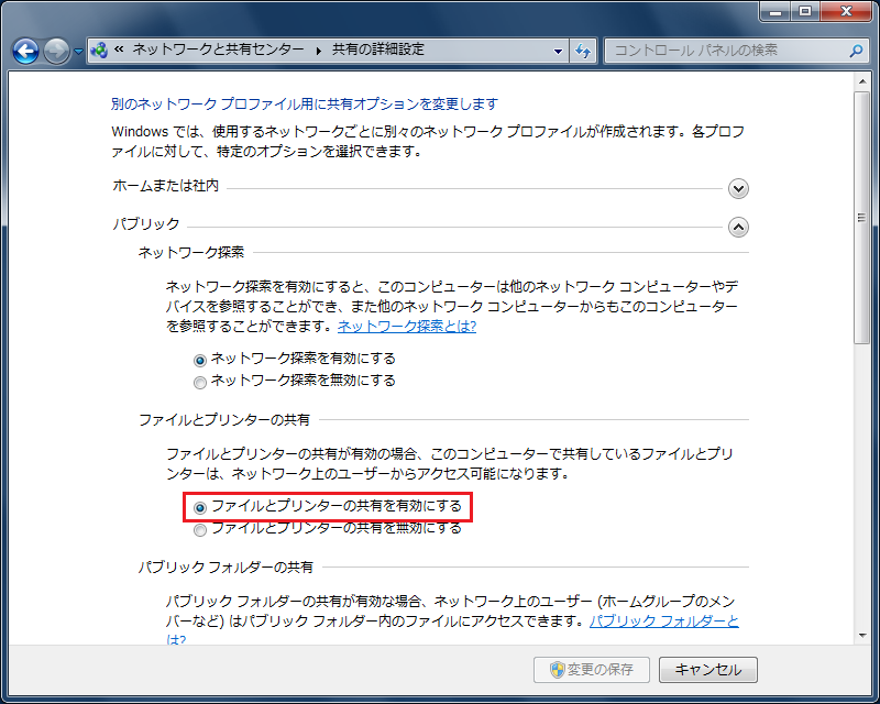 - 「ホームまたは社内」同様、「パブリック」の項目の以下の設定がすべて「有効」になっているかどうかを確認します。