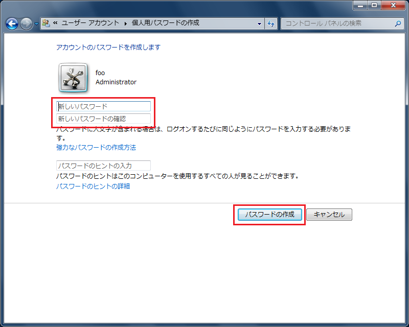 - 「新しいパスワード」、「新しいパスワードの確認」にパスワードを入力し、[パスワードの作成]をクリックします。