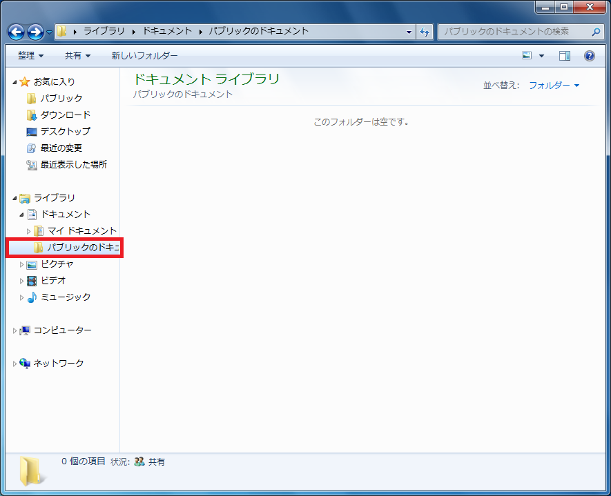 - エクスプローラーの左側の「ライブラリ」から[ドキュメント]-[パブリックのドキュメント]をクリックします。