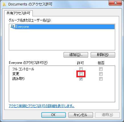 - 「Everyoneのアクセス許可」から「変更」欄の「許可」にチェックをつけます。