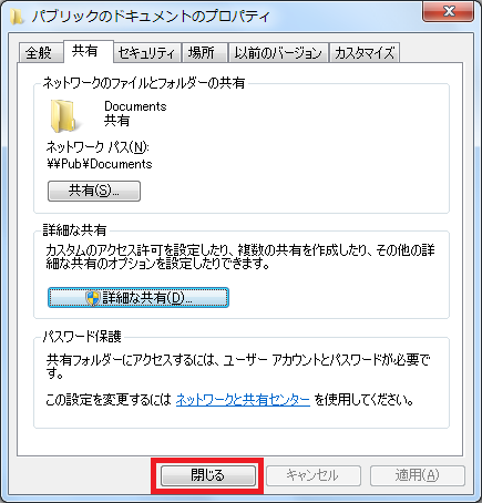 - 「パブリックのドキュメントのプロパティ」から[閉じる]をクリックします。