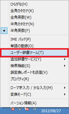 - メニューから[ユーザー辞書ツール]をクリックします。