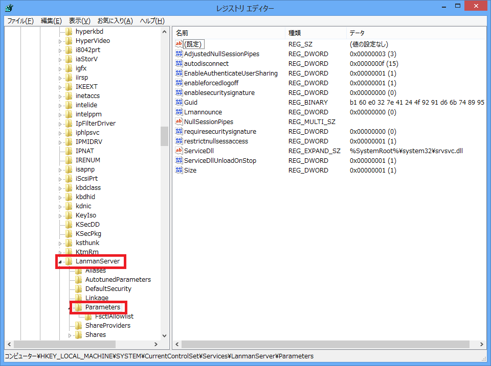 - HKEY_LOCAL_MACHINE→SYSTEM→CurrentControlSet→Services→LanmanServer→Parametersをクリックします。