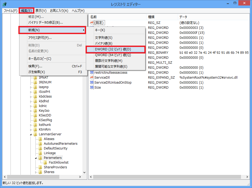- レジストリエディターのメニューから[編集]-[新規]-[DWORD(32ビット)値]を選択します。