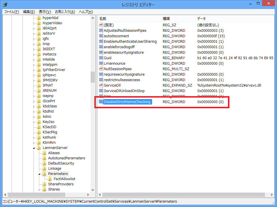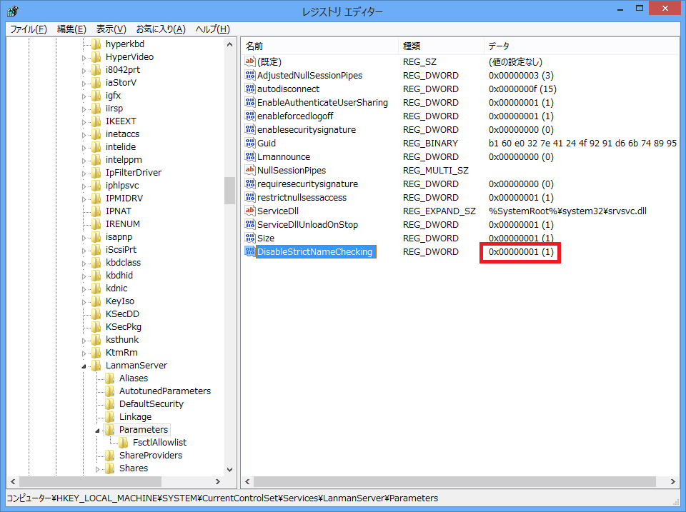- 「DisableStrictNameChecking」のデータ欄が「1」に変更されているか確認します。