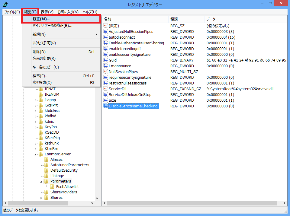 - レジストリエディターのメニューから[編集]-[修正]を選択します。