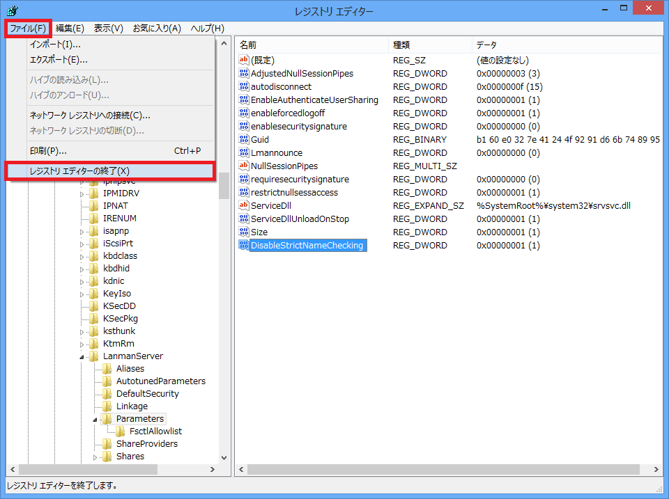 - レジストリエディターのメニューから[ファイル]-[レジストリエディターの終了]を選択し、レジストリエディターを終了します。