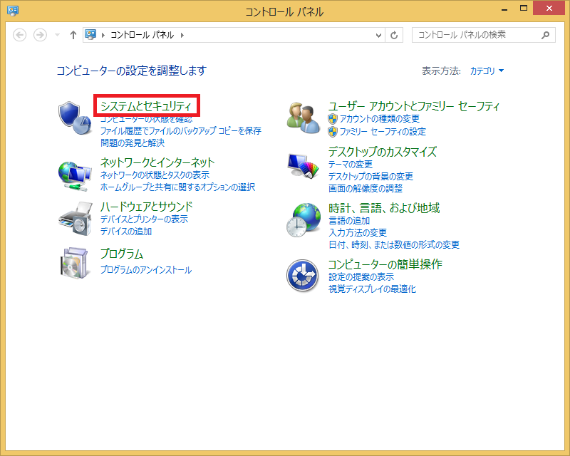 - コントロールパネルの「表示方法:カテゴリ」で、「システムとセキュリティ」をクリックします。