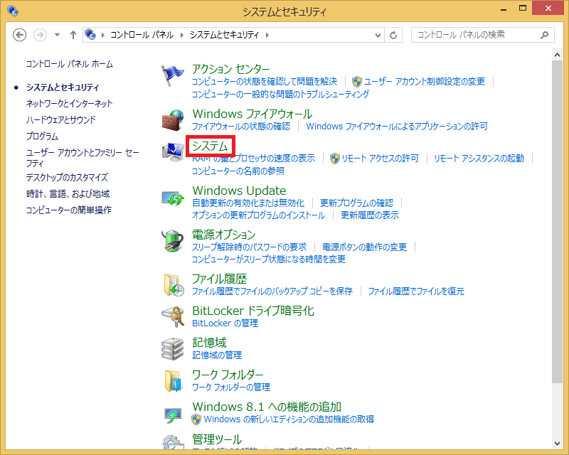 - 「システムとセキュリティ」から「システム」をクリックします。