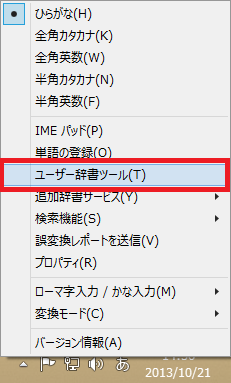 - メニューから[ユーザー辞書ツール]をクリックします。