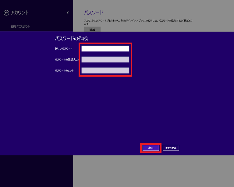 - 「新しいパスワード」、「パスワードの確認入力」、「パスワードのヒント」を入力し、[次へ]をクリックします。