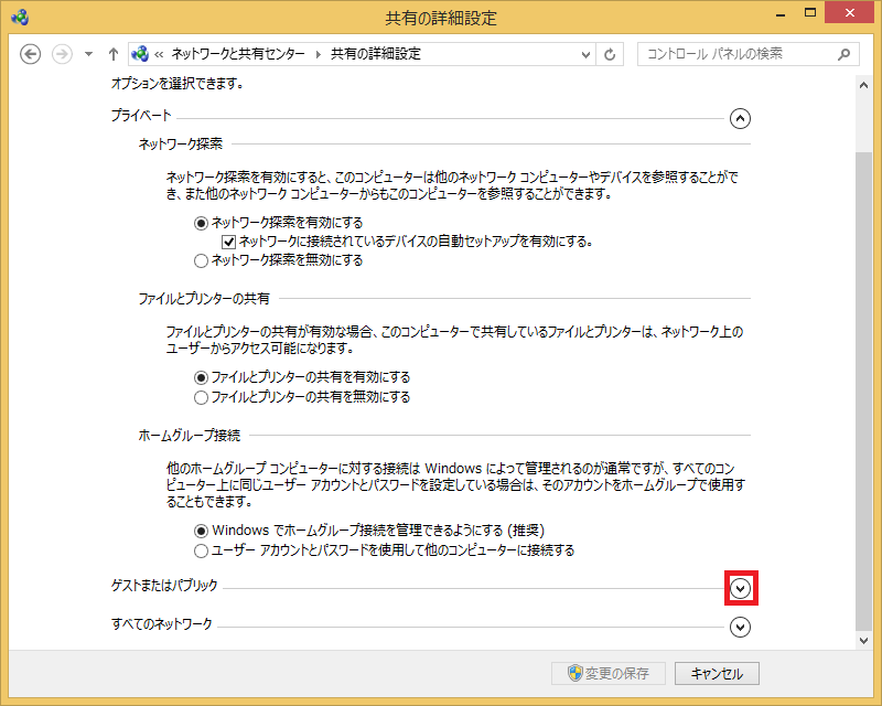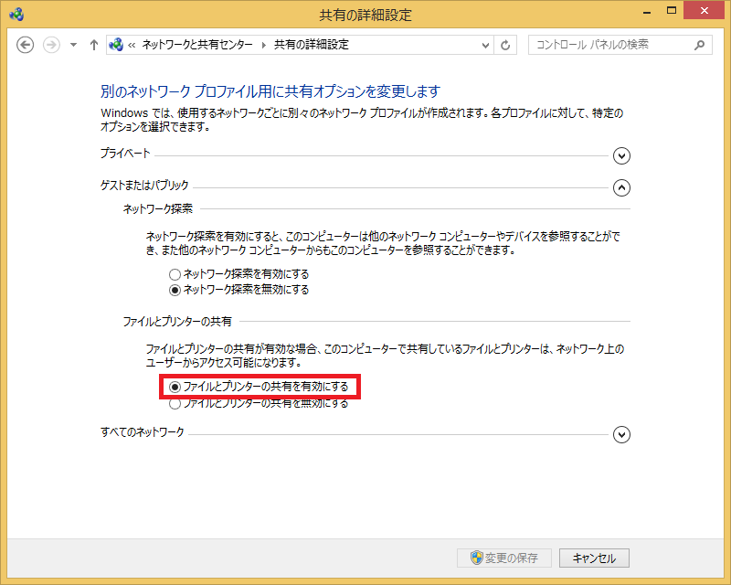 - 「ゲストとパブリック」の項目の「ファイルとプリンターの共有」の設定が「有効」になっているかどうかを確認します。
