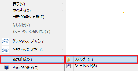 - デスクトップで、マウスの右ボタンをクリックし、メニューから[新規作成]-[フォルダー]をクリックします。