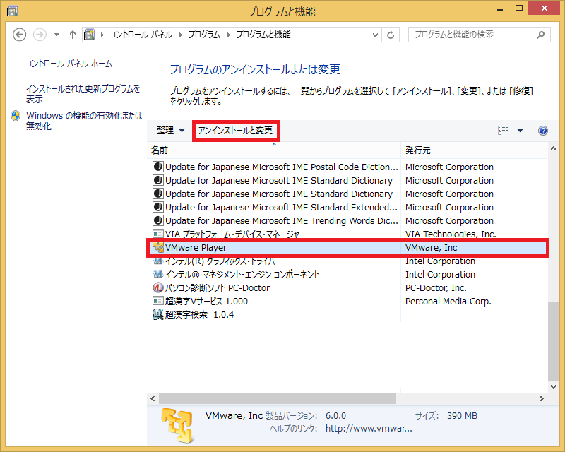 - 「名前」欄の「VMware Player」をクリックし、[アンインストールと変更]をクリックします。