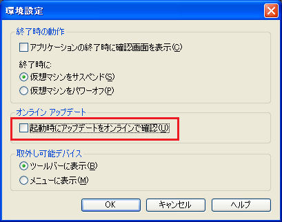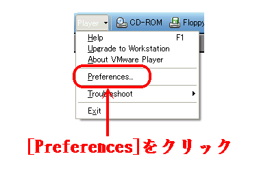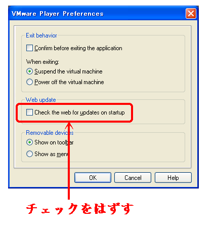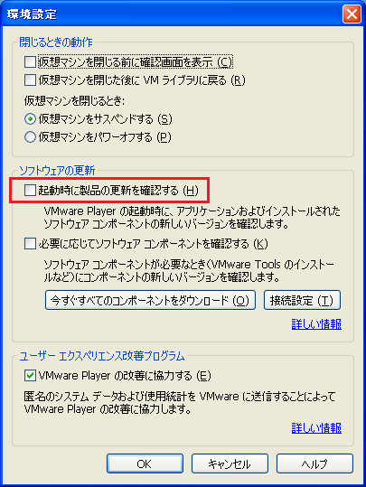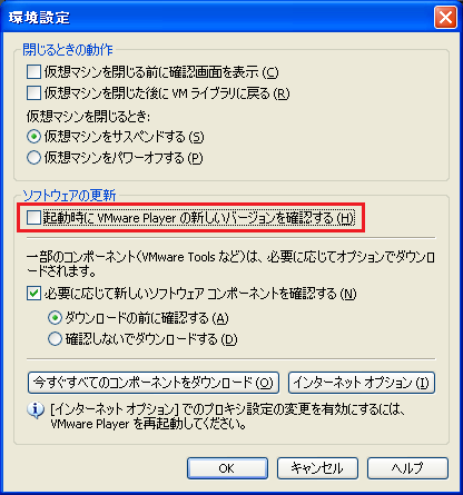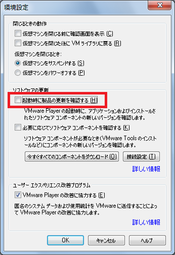 なお、VMware Playerの最新版の確認の機能を無効にすることができます。以下の操作を実施してください。