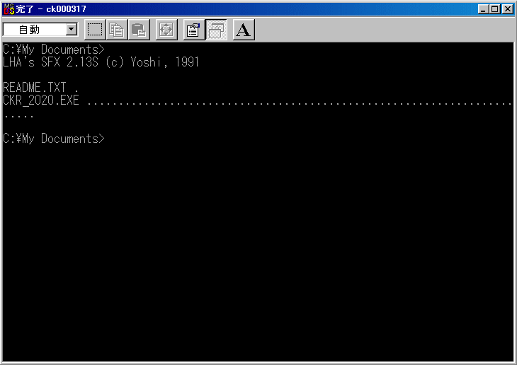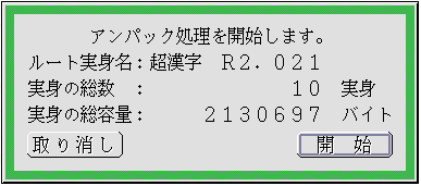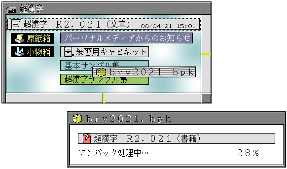 ドラッグ先(初期ウィンドウ)に「超漢字 R2.030」の仮身が現れ、 アンパック作業が行われます (画面例)。