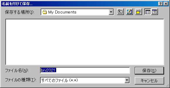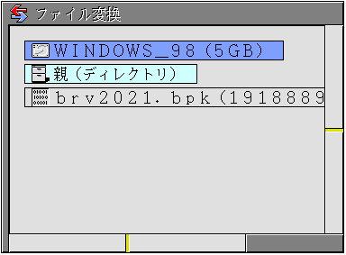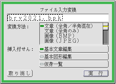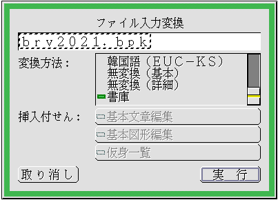 brv2030.bpkの上まで持って行ったら、マウスの左ボタンをプレスします(押したままにします)。ポインタが「握り」に変化しますので、そのまま初期ウィンドウの上までポインタを持って行き、マウスの左ボタンをリリースします(離すます)。ファイルの変換方法をたずねる「ファイル入力変換」のパネルが現れます (画面例)。