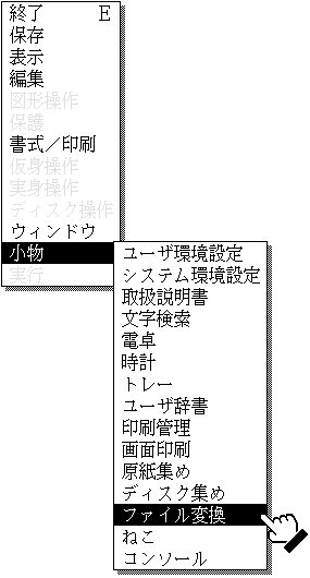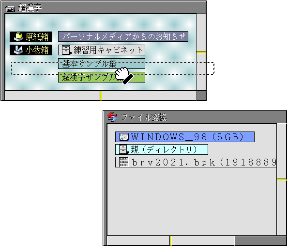 注:ドラッグの方法…ポインタを仮身「超漢字 R2.030」の上まで持って行ったら、マウスの左ボタンをプレスします(押したままにします)。ポインタが「握り」に変化しますので、そのまま初期ウィンドウの上までポインタを持って行き、マウスの左ボタンをリリースします(離します)。