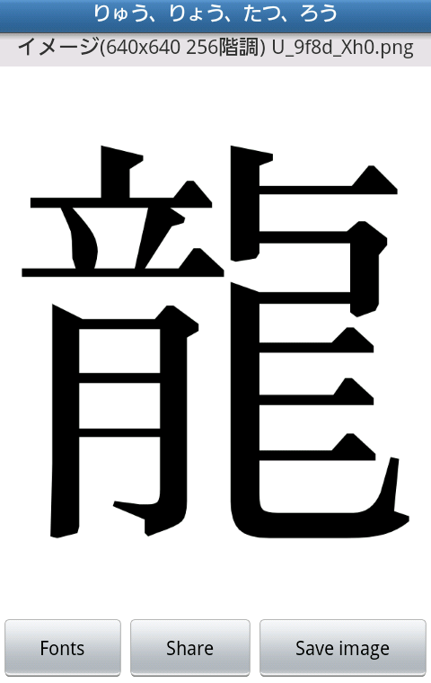 By tapping the original character at the upper side of the screen, the character is magnified and displayed in full screen. You can change and check the magnified character's font in real time. Also, you can save the magnified character as an image, and share the magnified character with other apps.