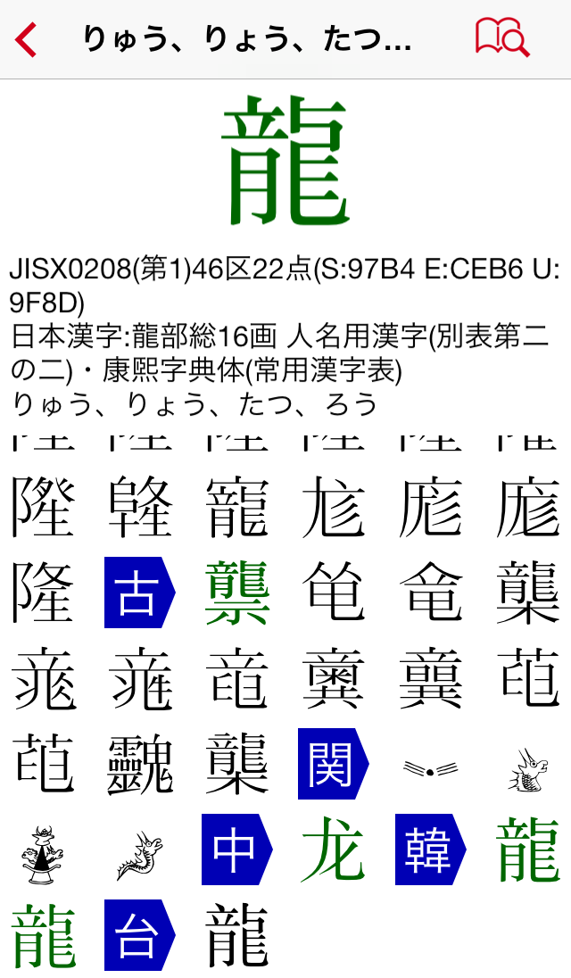 You can access a wide range of information on variant/related characters, including correspondences between new character shapes and old character shapes, original characters and variant characters for names/places, Japanese kanji and Chinese/Korean kanji, Kanji and Tompa/Hentaigana.