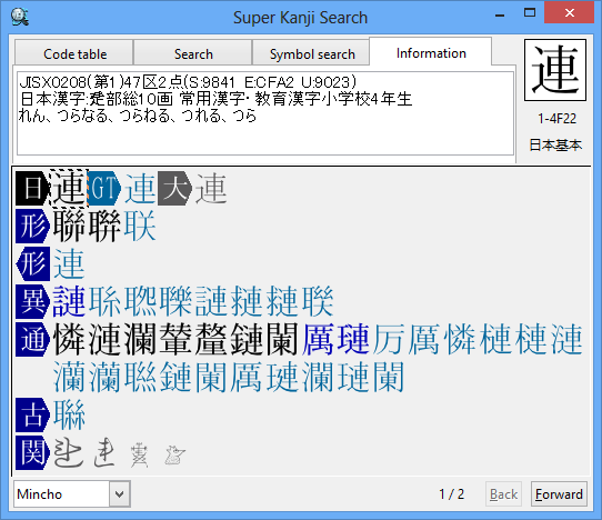 † You can also find out the character info by copying &T-formatted TRON code in the other app to the clipboard and pasting the TRON code to Super Kanji Search.