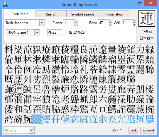 You can search characters at Code table. If you already know the character code of the character you want, it's easier to use Code table.