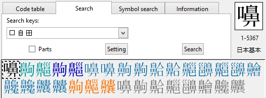 Search results are displayed in Character List Area. You can find the desired kanji at the beginning of the list. The kanji "嚊" is surrounded by a flickering frame. The magnified same kanji is also displayed in Selected Character Area at the upper right corner of the window.