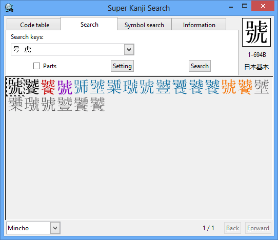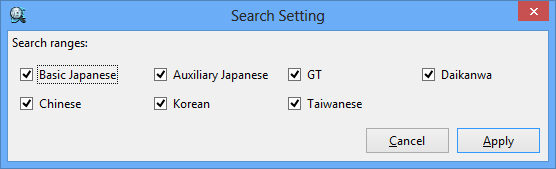 † The following search examples are just a part of the search results. As the search range, "Basic Japanese" is selected in the setting dialog. The following search results are the characters in JIS Level 1.