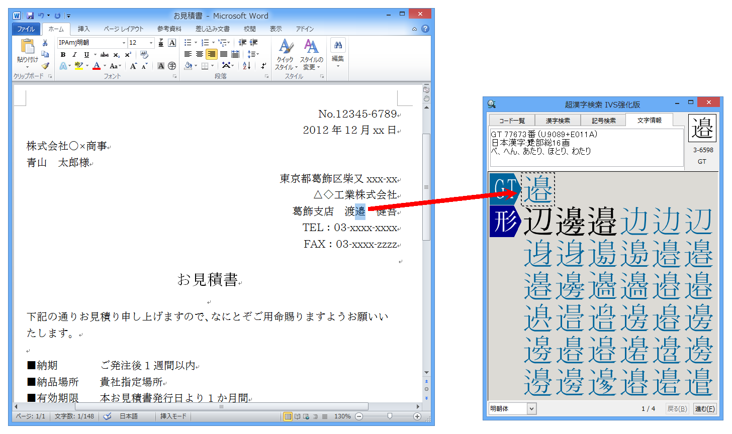 Under these circumstances, IVS(*2) function was introduced to handle variant characters of kanji as coded characters in Unicode. Starting with Windows 8 went on sale on October 2012, the number of OS and application software which support IVS is increasing(*6). Besides, Information-technology Promotion Agency, Japan (IPA) started to release "IPAmj Mincho Font"(*7) for free since October, 2011. "IPAmj Mincho Font" includes a lot of variant characters supporting IVS. In this way, the environment on Windows for handling a lot of variant characters systematically without external characters or imaged characters has been prepared.