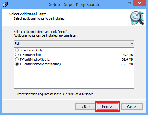 - In the window for the additional font selection, the same setting as before is automatically selected. Click [Next] without changing the setting.