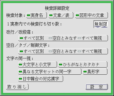 この場合、検索結果のウィンドウには、検索を打ち切った時点までの検索結果のみが表示されます。検索打ち切り数は、1、5、10、20、30、40、50、100、無制限が選べます。無制限を選ぶと、検索の打ち切りは行わずに、実身内をすべて検索します。