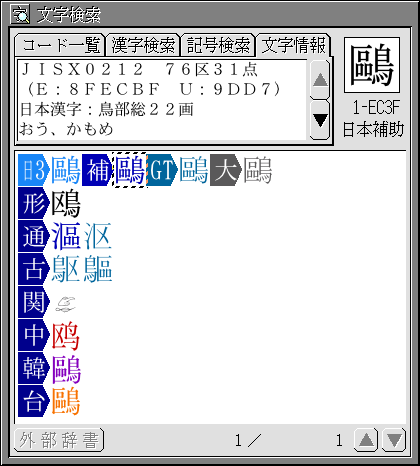 異なる文字セットの同一文字、異形字、日中韓台の対応漢字との関係を一覧できます。