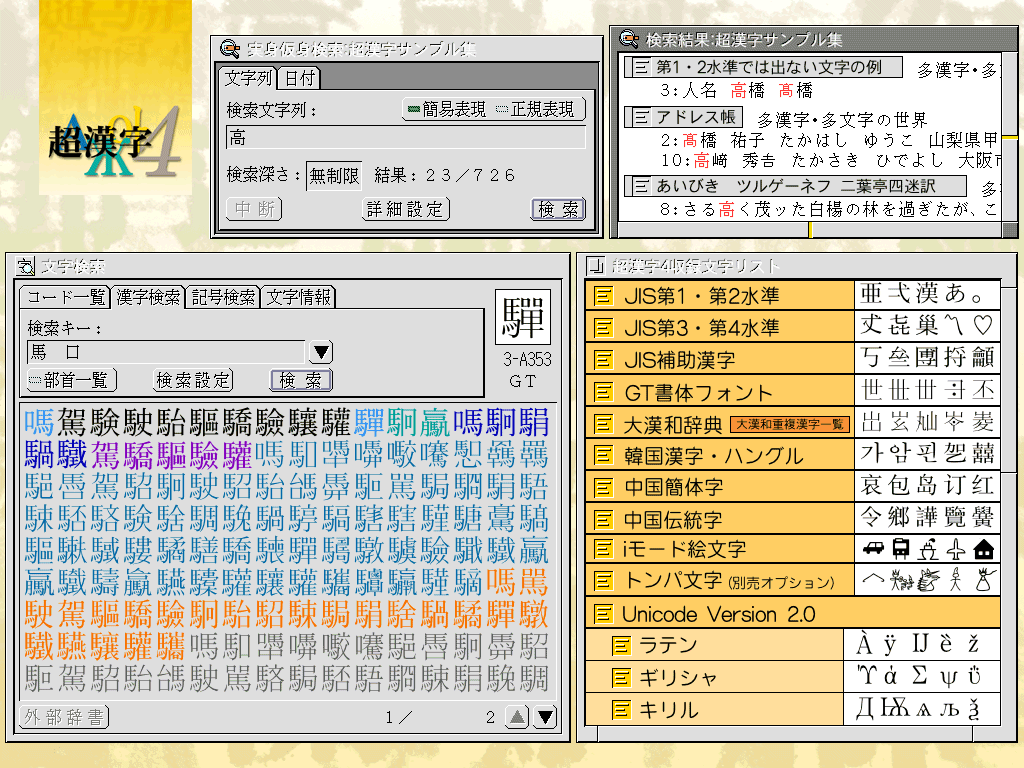 超漢字4では、超漢字3までに培ってきた多漢字・多文字環境を一層充実させただけではなく、その活用を支援する機能を大幅に強化いたしました。具体的には、まず新開発の異形字ゆらぎ検索機能により、異形字の区別を気にせずに文字列の検索を行うことができます。たとえば、「高(*1)」と「 (*2)」や「崎(*3)」と「 (*4)」などの人名漢字を区別して作成された顧客ファイルにおいて、従来の超漢字3でも「高崎」と「 」を個別に検索することは可能でしたが、超漢字4では、検索キーとして「高崎」を指定することにより、「高崎」「 崎」「高 」「 」などのすべての組み合わせを一度に検索できます。 同様に、「 (*5)小平」を検索する際、JIS補助漢字66区39点(BTRON上のTRONコードでは1-E247)、JIS第3水準92区80点(TRONコードでは1-7C70)、中国伝統字(CNS 11643規格)1面79区50点(TRONコードでは6-6F52)、GT書体フォント53330番(TRONコードでは3-554A)などに割り当てられている「 」を区別なく検索できますので、検索時にどの文字セットや文字コードが使われているかを意識する必要がなく、快適な多漢字環境を利用できます。さらに、新字体の「桜」と旧字体の「櫻」や、日本漢字の「広」と中国簡体字の「广」と中国伝統字の「廣」などを区別なく検索することも可能です(表1)。一般に、多漢字環境を活かして細かい字形の区別を行おうとすると、検索や同定の処理が面倒になるという問題を生じますが、この問題は超漢字4の異形字ゆらぎ検索機能によって解決され、超漢字シリーズ本来の特長である多漢字機能をより積極的に活用できるようになります。