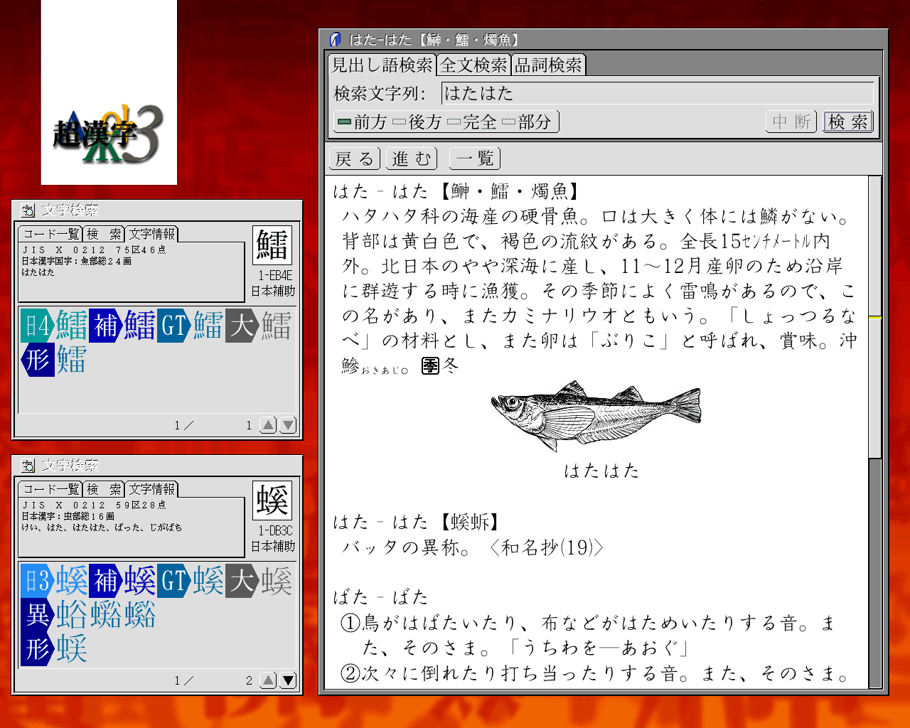 パーソナルメディアから今回発売される「超漢字広辞苑」は、岩波書店より『広辞苑第五版』の電子データのライセンスを受け、超漢字3上で閲覧できるようにした電子辞書ソフトウェアです。その最大の特長は、150万の文字を自由に扱えるTRONコードの利用により、書籍版「広辞苑」の字形を正確に反映していることです。辞書の閲覧時はもちろん、その内容を切り貼りしてワープロソフトやデータベースソフトなど他のウィンドウにコピーした場合でも、常に書籍版の「広辞苑」と同じ正確な字形で表現されます。超漢字3上では、すべてのアプリケーションが自由にTRONコードを扱えますので、「超漢字広辞苑」から切り貼りした文字データを他のアプリケーションで利用する場合にも、字形の変わる心配がありません。
