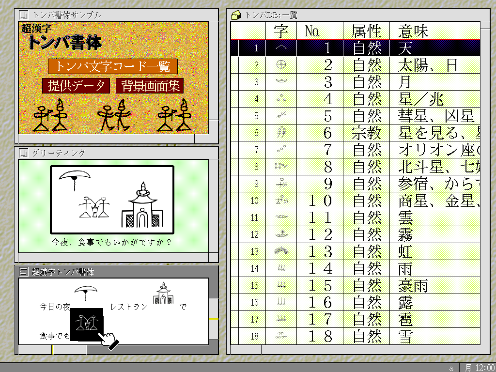 「超漢字トンパ書体」は、このトンパ文字を「超漢字3」上で自由自在に使えるようにするための文字フォント(書体)です。「超漢字3」には、漢字や世界各国の文字を合わせて既に17万以上の文字フォントが実装されていますが、今回発売する「超漢字トンパ書体」により、トンパ文字と既存の17万以上の文字を自由に混在し、ワープロ、表計算、データベースなど多くのアプリケーション上で利用できるようになります。また、実身名(ファイル名)やかな漢字変換辞書のように、OS自身の管理する部分においても、トンパ文字を含めた17万以上の文字をすべて利用できます。たとえば、「超漢字トンパ書体」付属の「トンパ辞書」をOSに登録すれば、かな漢字変換機能による読みからトンパ文字への直接変換が可能となり、トンパ文字の活用チャンスがさらに広がります。