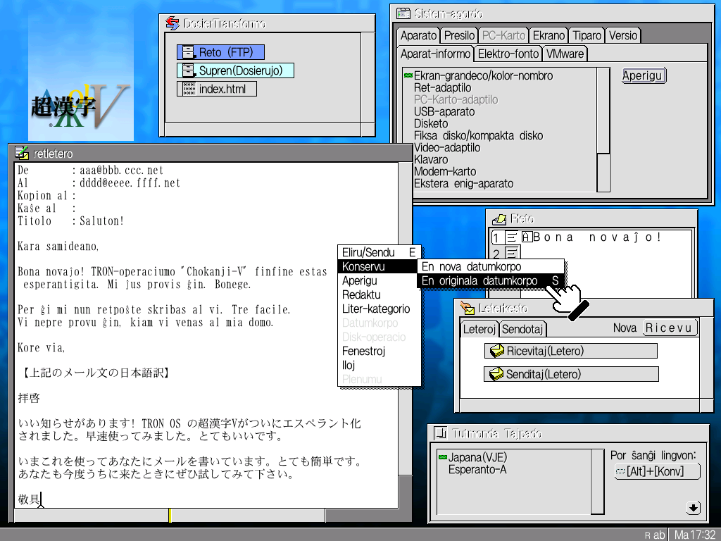 Windowsの場合、Wordなどのアプリケーションの中でエスペラント語を扱うことは可能ですが、OSやアプリケーションのメニューやメッセージは日本語や英語で表示されます。これに対して、「超漢字Vエスペラント対応キット」ではOSから主要なアプリケーションのすべてを世界で初めてエスペラント化し、エスペラント語の分かるユーザが容易に操作できるパソコン環境をご提供します。