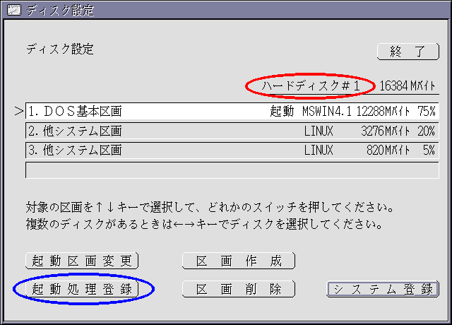 またご質問のように、ハードディスクに複数のOS(WindowsやLinuxなど)が登録されている場合には、パソコンの電源を入れたときや再起動時に、起動したいOSを選択するツールを組み込むことができます。これは「ディスク設定」画面中の左下にある[起動処理登録]を行うことで、ハードディスクに組み込むことができます。